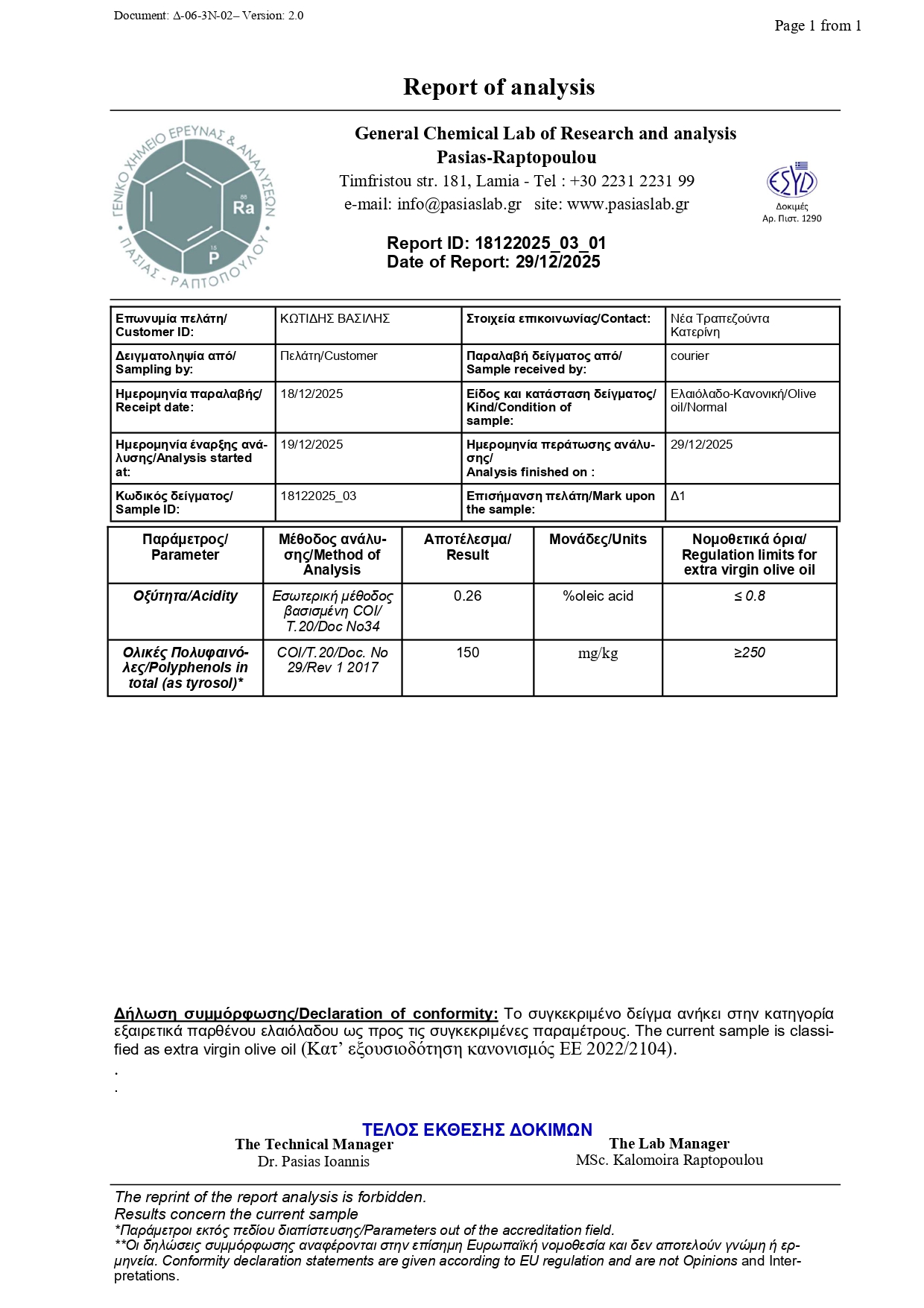 • Υψηλή Συγκέντρωση: Τα 220mg/kg (που είναι πιθανό το σχήμα) είναι πολύ καλή τιμή, καθώς πολλά EVOO έχουν 100-250 mg/kg, ενώ τα υψηλής περιεκτικότητας (health claim) μπορεί να ξεπερνούν τα 250 mg/kg ή και τα 500mg/kg.