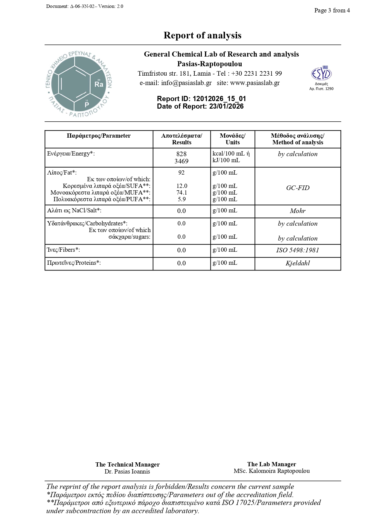 • Οξύτητα (0,21%): Είναι πολύ χαμηλή, γεγονός που υποδηλώνει υγιή καρπό και άμεση έκθλιψη μετά τη συγκομιδή. Το όριο για το "έξτρα παρθένο" είναι το 0,8%, οπότε το 0,21% θεωρείται κορυφαίο.